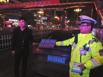 一辆黑色奥迪轿车,每次上高速都换上别的车牌,交通违法达到64次。车主自以为很完美,没想到已经被兰州交警盯上,缉查布控加视频追踪三天。3月21日晚,当该车从高速返回兰州后,在双城门被交警当场截获,并从脚垫下找到假车牌。